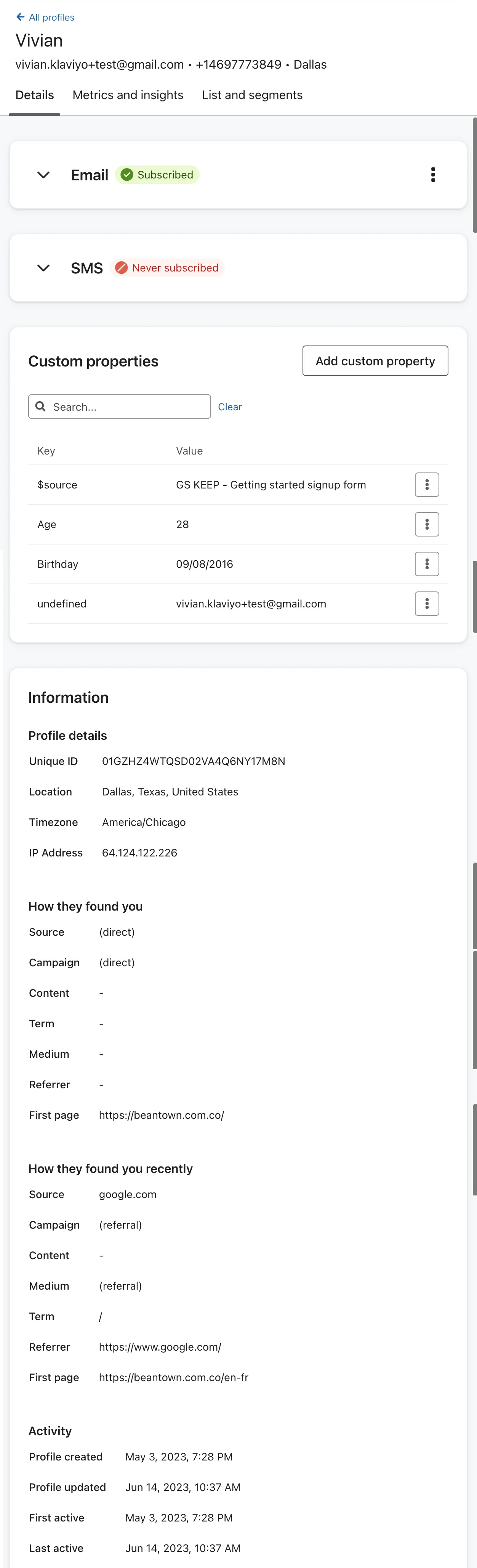 Within a profile, you can see a snapshot of the individual in the form of profile properties, actions that individual has taken, and other key details on how this profile was added into Klaviyo.