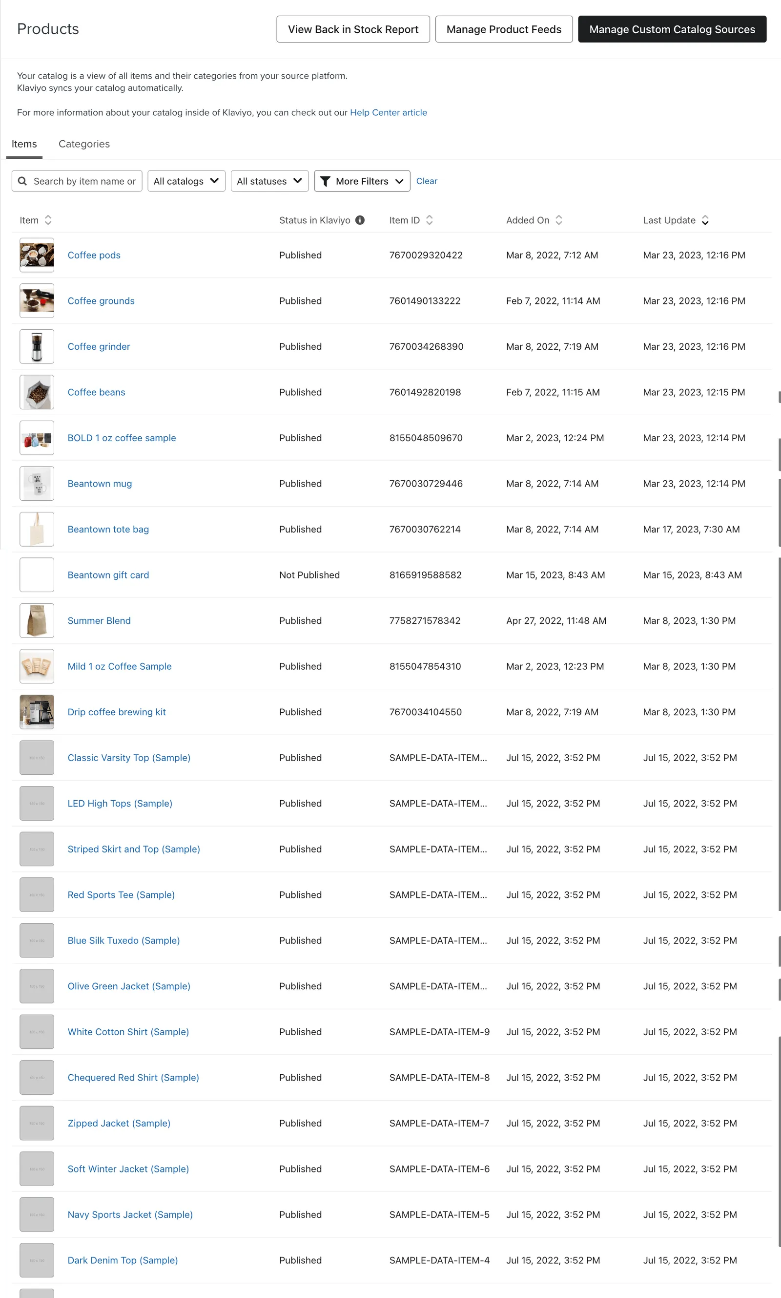 Within the Klaviyo catalog, you can include all of the items your brand manages. Catalog items can be physical items (like a T-shirt), digital items (like an eBook download) or even virtual offerings (like a guided tour). Each catalog item is required to have an ID, title, description, image, and corresponding product URL.