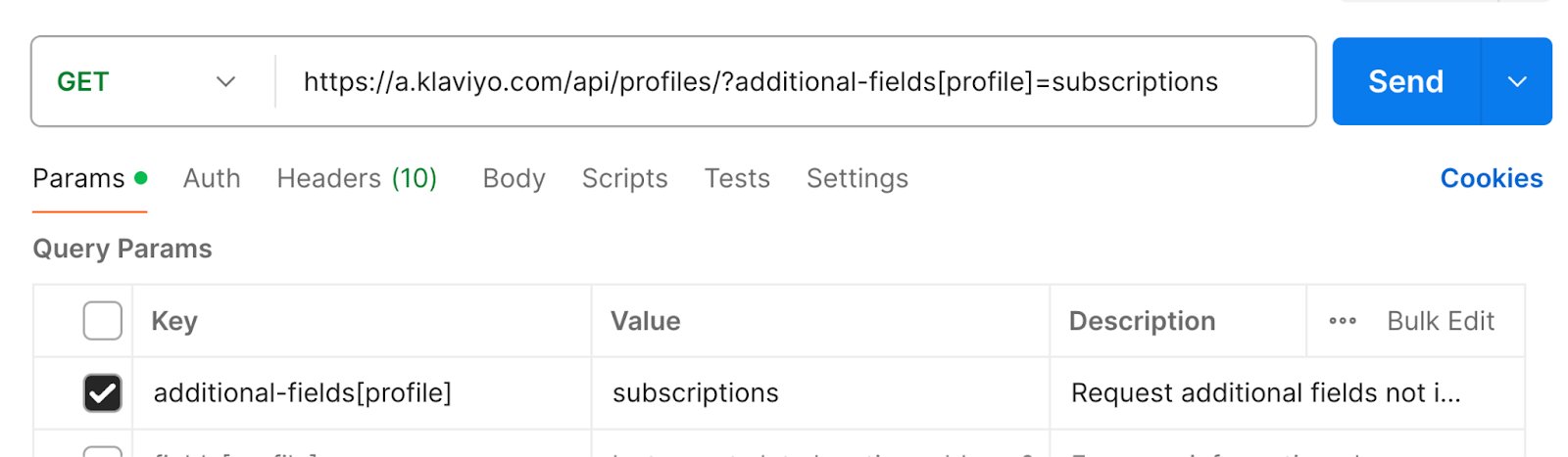 Looking through this endpoint's documentation, they also see that subscription information is not included by default, but they can get this information as well using the query parameter additional-fields[profile]=subscriptions: