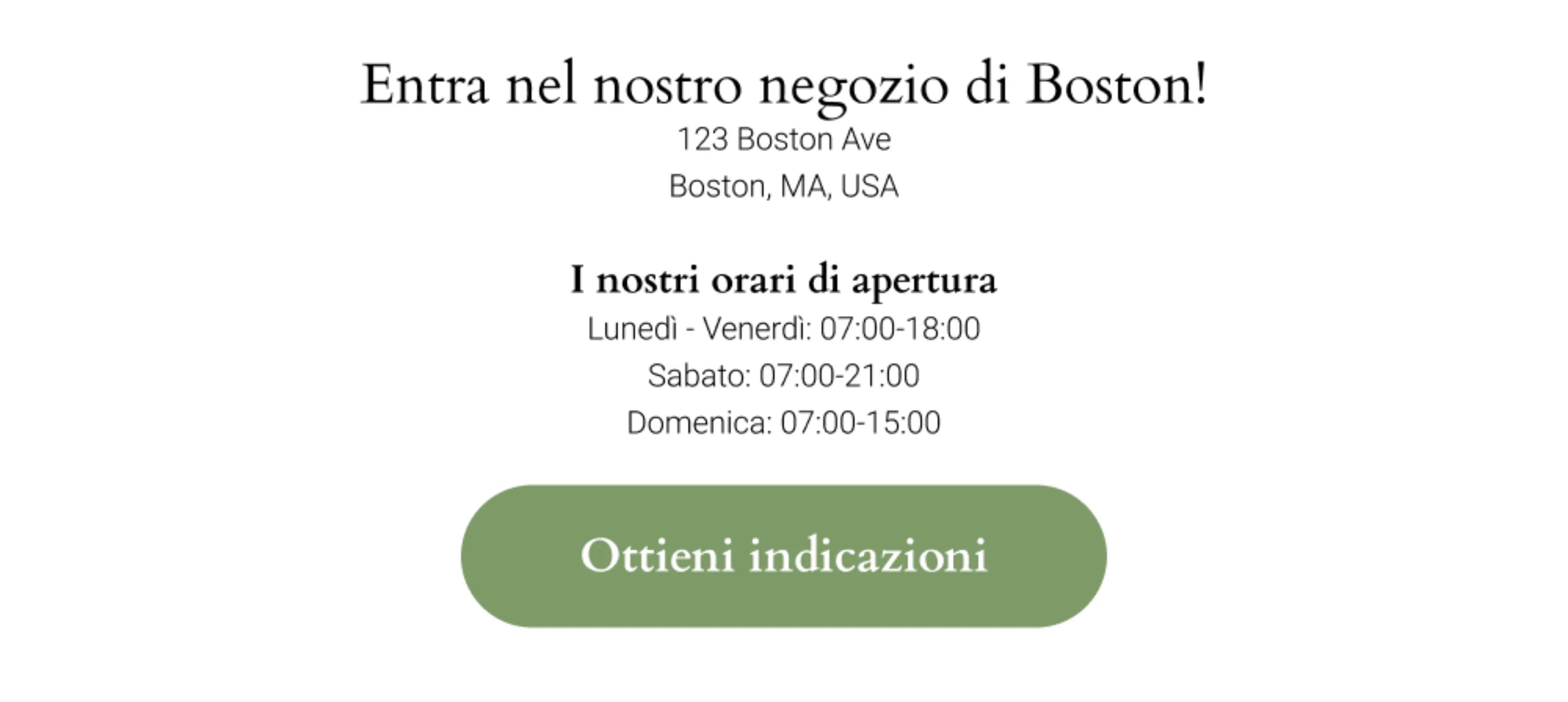 Cosa includere: orari di apertura, screenshot di una mappa (se necessario per il parcheggio o le indicazioni) e un pulsante che rimanda alla posizione della tua attività su Google Maps.