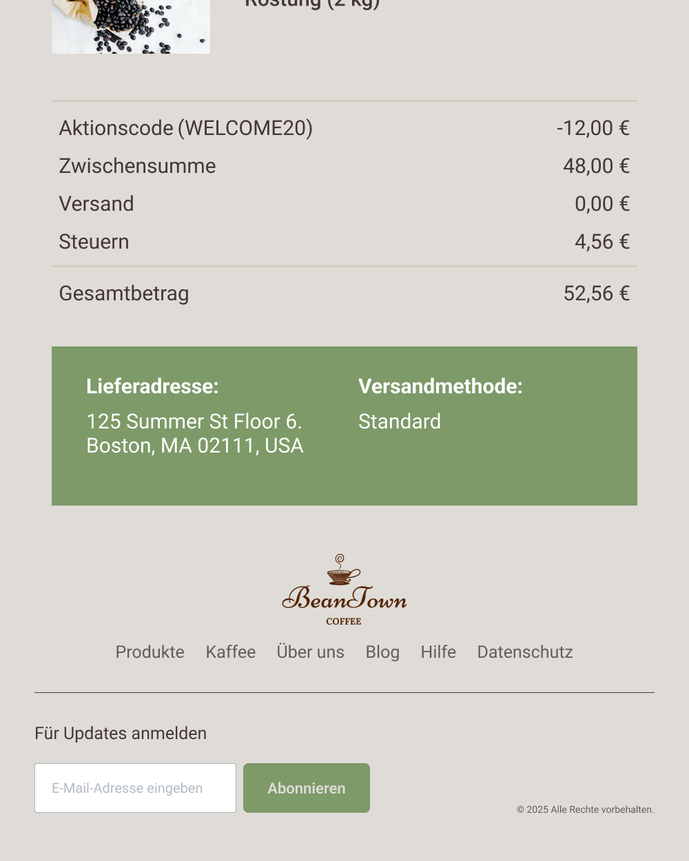 Beantown zum Beispiel nutzt diesen Bericht, um zu ermitteln, aus welcher Quelle die meisten Abonnent*innen stammen. Im Februar allein konnte Beantown 22 neue Abonnent*innen verzeichnen. Nächsten Monat wird das Unternehmen ein Pop-up-Formular erstellen, um neue Abonnent*innen zu erfassen, und die Ergebnisse mit dem Wachstum im Februar vergleichen. Dadurch kann der Kaffeespezialist Erkenntnisse darüber gewinnen, worauf er seine Akquisebemühungen konzentrieren sollte.