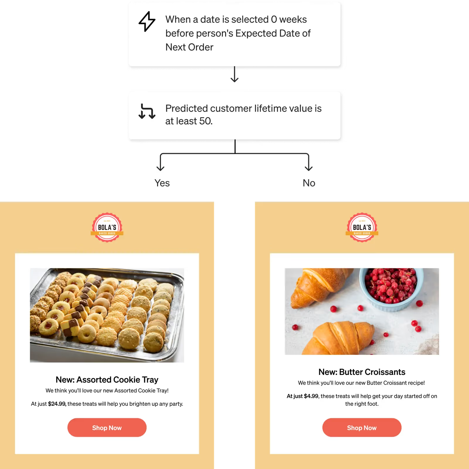 Bola’s Baked Goods triggers their repeat purchase flow by the expected date of next order. They branch the flow by predicted CLV, so they can send targeted messages to each group based on their spending potential.
