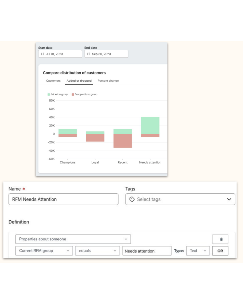 Step 1: Create an RFM segment of needs attention and email consent is unsubscribed.
