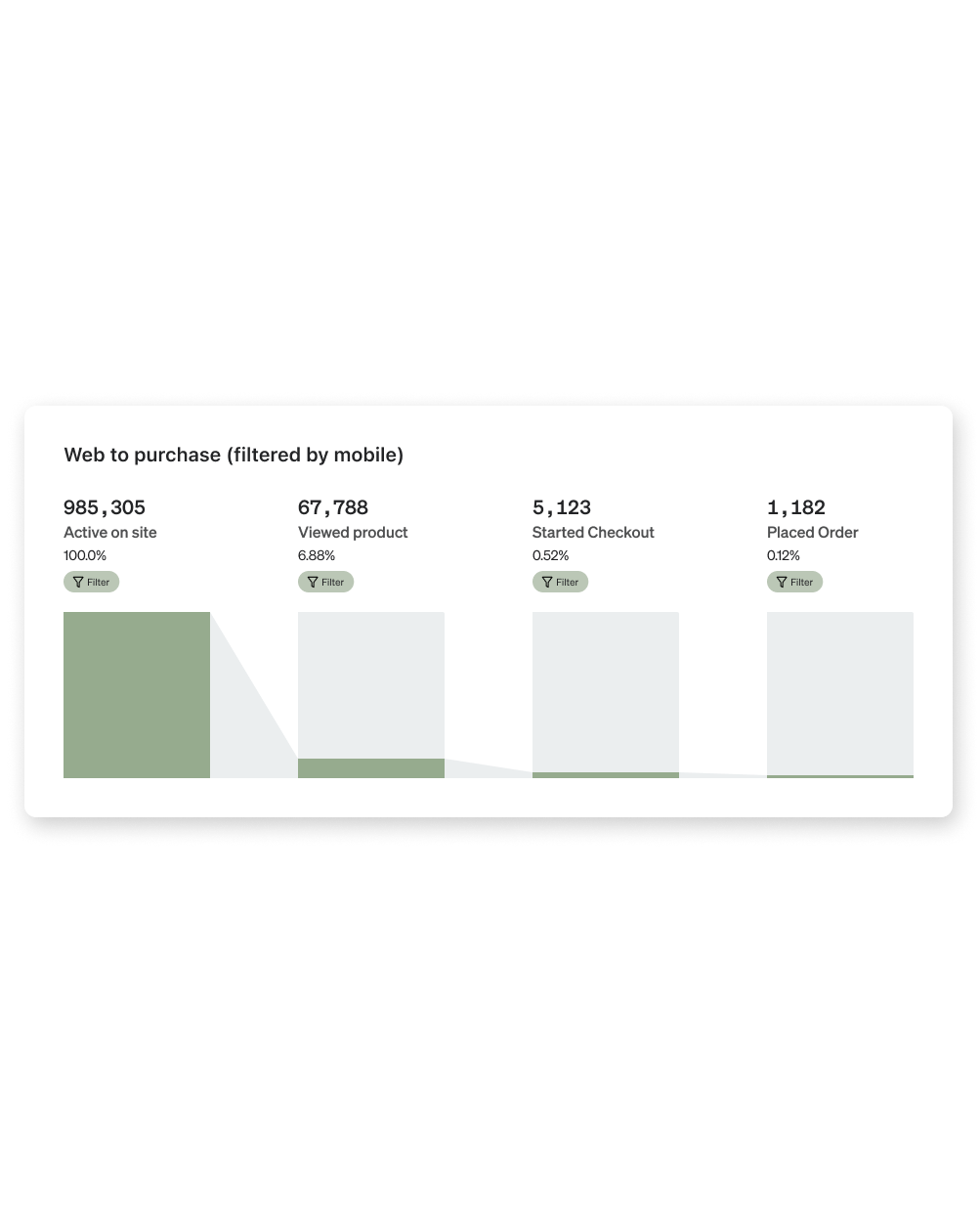 Use Funnel analysis to monitor how visitors engage with your site and their journey from navigating to your homepage all the way to placing an order. This helps you pinpoint where customers may drop off and helps you refine key stages of your journey. You can also filter funnels by different timeframes to determine if your performance has improved.