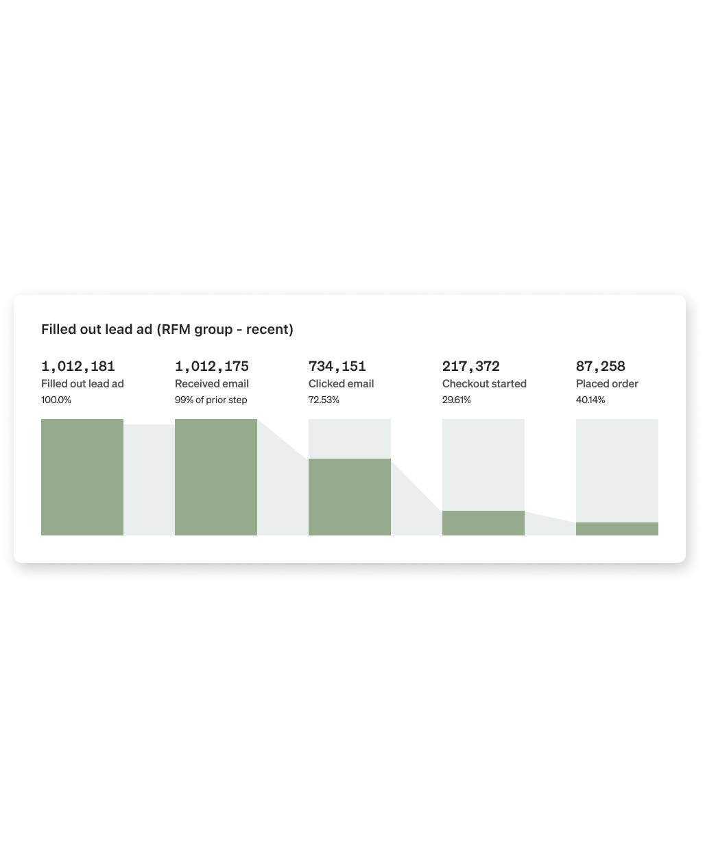 You likely have a robust ad strategy, and may be curious how this impacts your overall placed orders. Track how customers behave after filling out a lead ad or visiting your website from a tracked ad using Funnel analysis. You can further filter this data by RFM cohort to determine if there are any key differences in dropoff points.