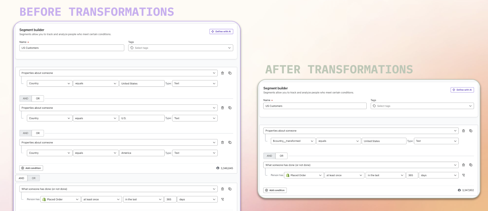 Once you have transformed your frequently-used custom properties, revise any segment definitions that included the original version of the property and switch the criteria to include the transformed version instead. You should see an increase in segment size once you start using the transformed property that more accurately aggregates profiles.