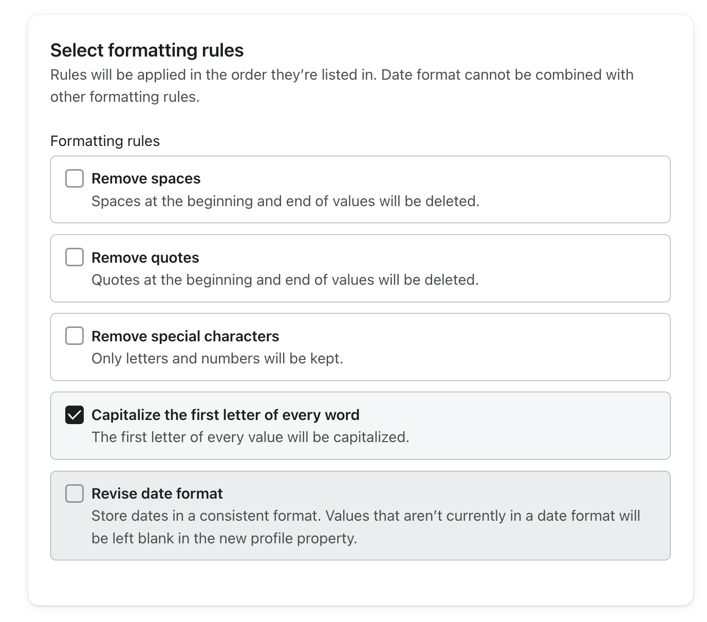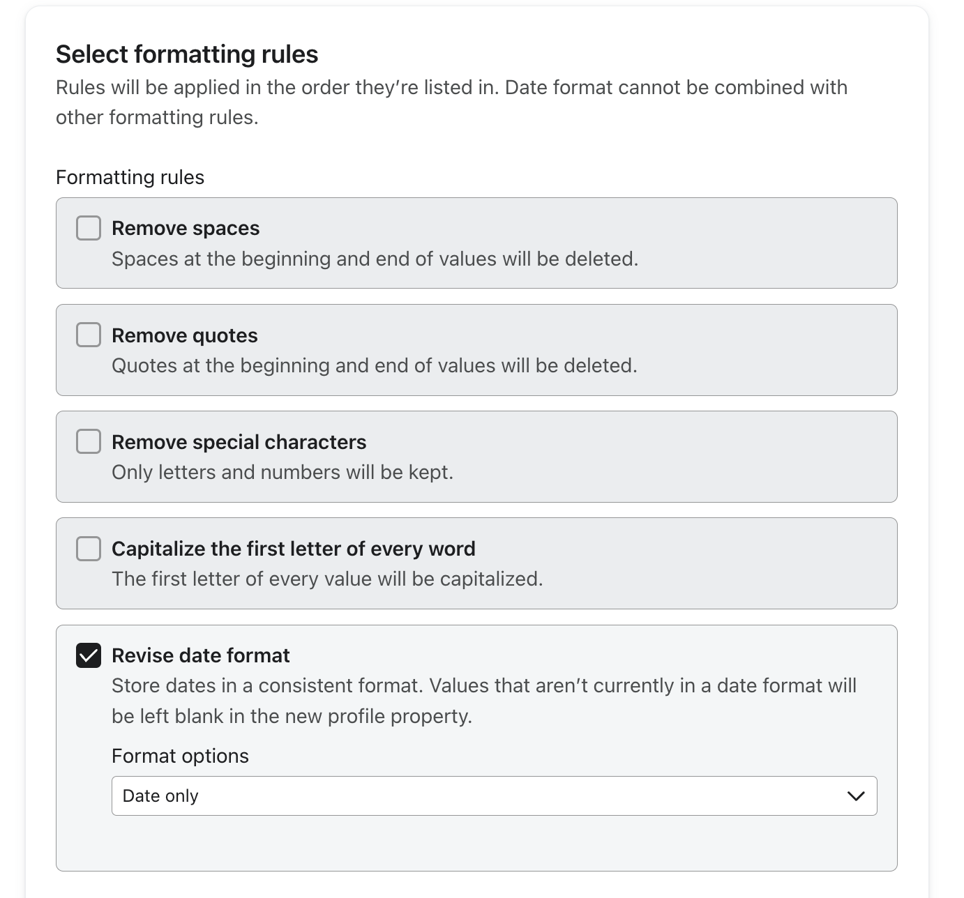 Ensure birthday properties are formatted as dates for use in segments, flows, and campaigns. Select Format birthdays as a pre-built transformation to store birthdays in a consistent date format (ex: February 17th, 2009 will become 02/17/2029).