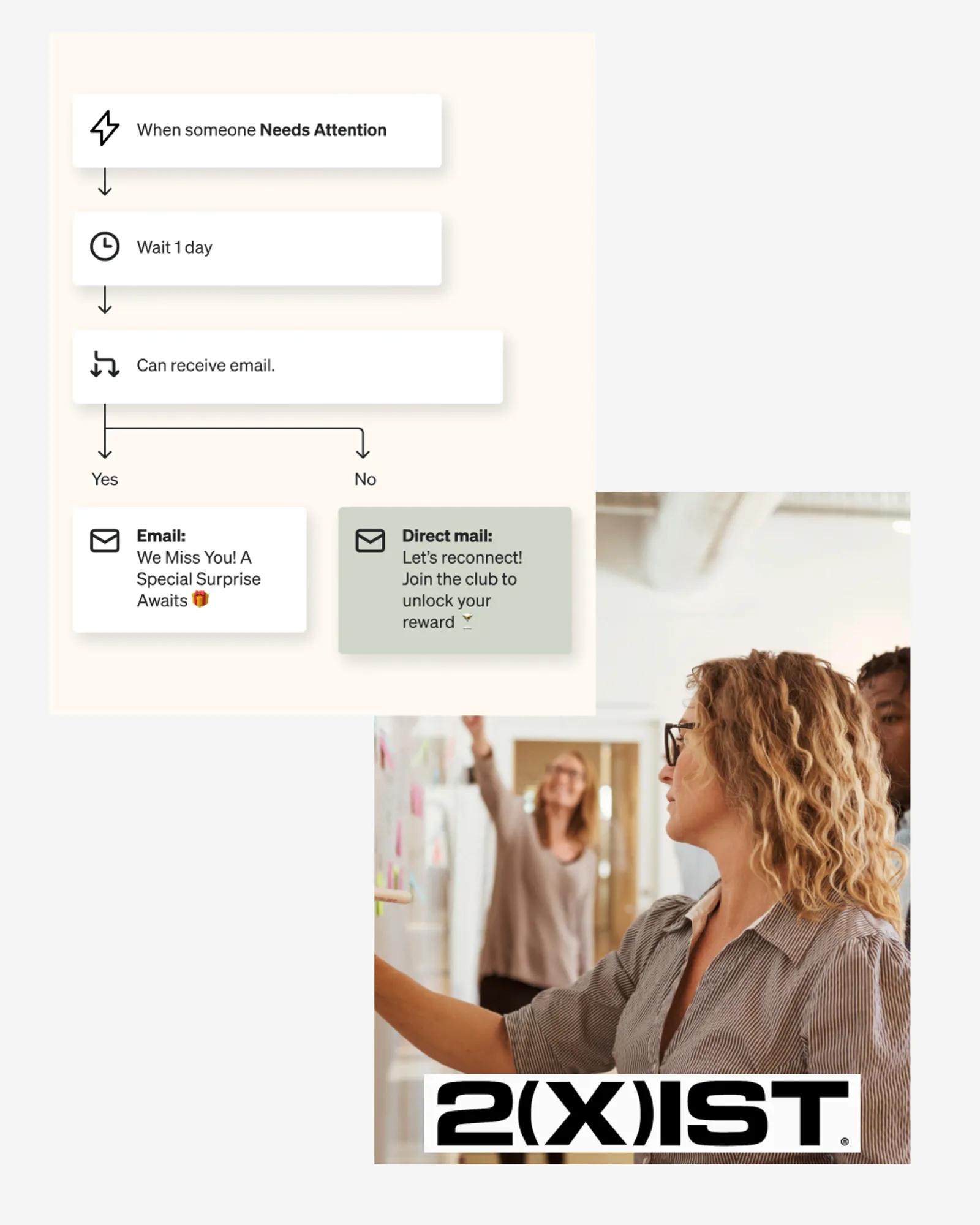 - Recapturing disengaged customers: 2xist used direct mail to reconnect with 6,000 Needs Attention customers who had opted out of email, earning a 3.4x ROAS and proving its power to reactivate disengaged shoppers.