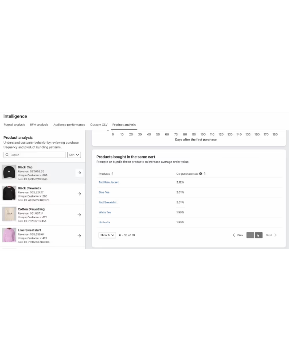This list reveals products purchased alongside your selected product, helping you pinpoint opportunities for cross-selling, bundling, or offering discounts on related items at checkout.