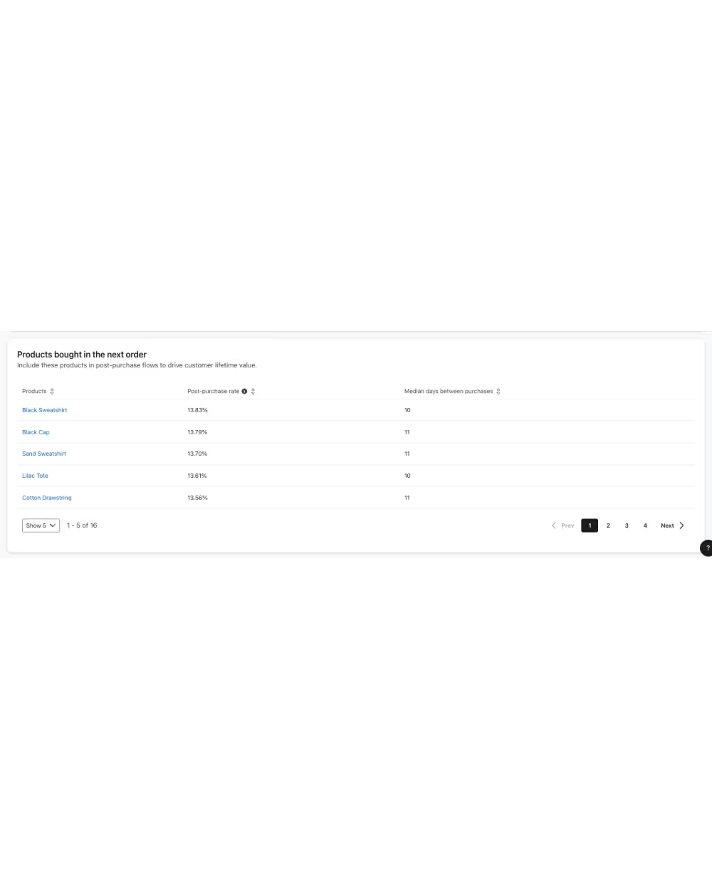 This card lists products that customers typically purchase after buying a specific product. It helps you craft targeted post-purchase flows, campaigns, or discounts to encourage customers to return and buy products they usually purchase next.