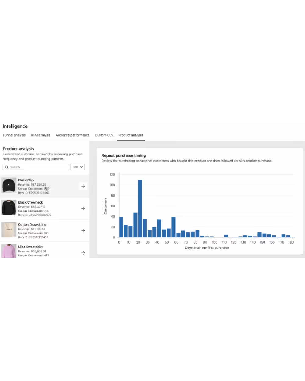 This chart visualizes the time between a product purchase and the next purchase, allowing you to craft flows and campaigns relative to when your customers would make a next purchase.