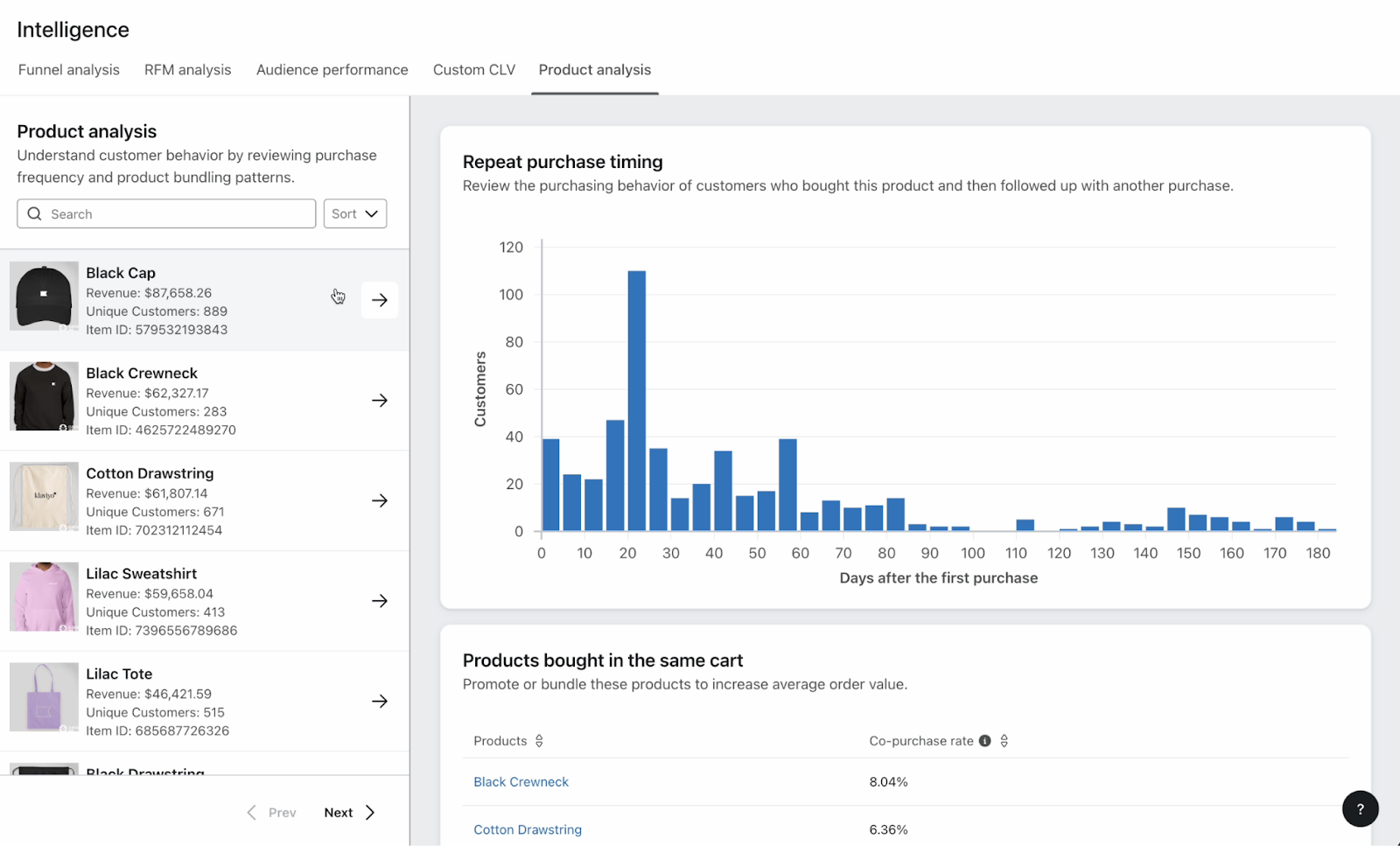1. Check the Products Bought in the Same Cart card on your product analysis dashboard. Which products are frequently purchased with your top-selling item? For example, customers might often buy a crewneck in the same cart as the cap shown above.
