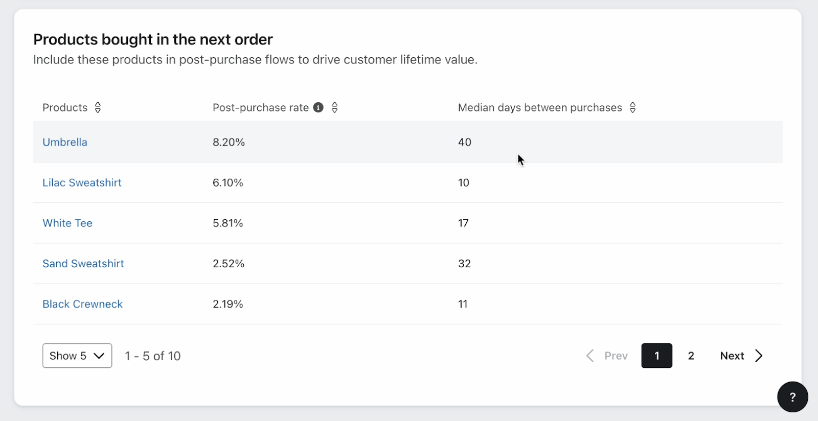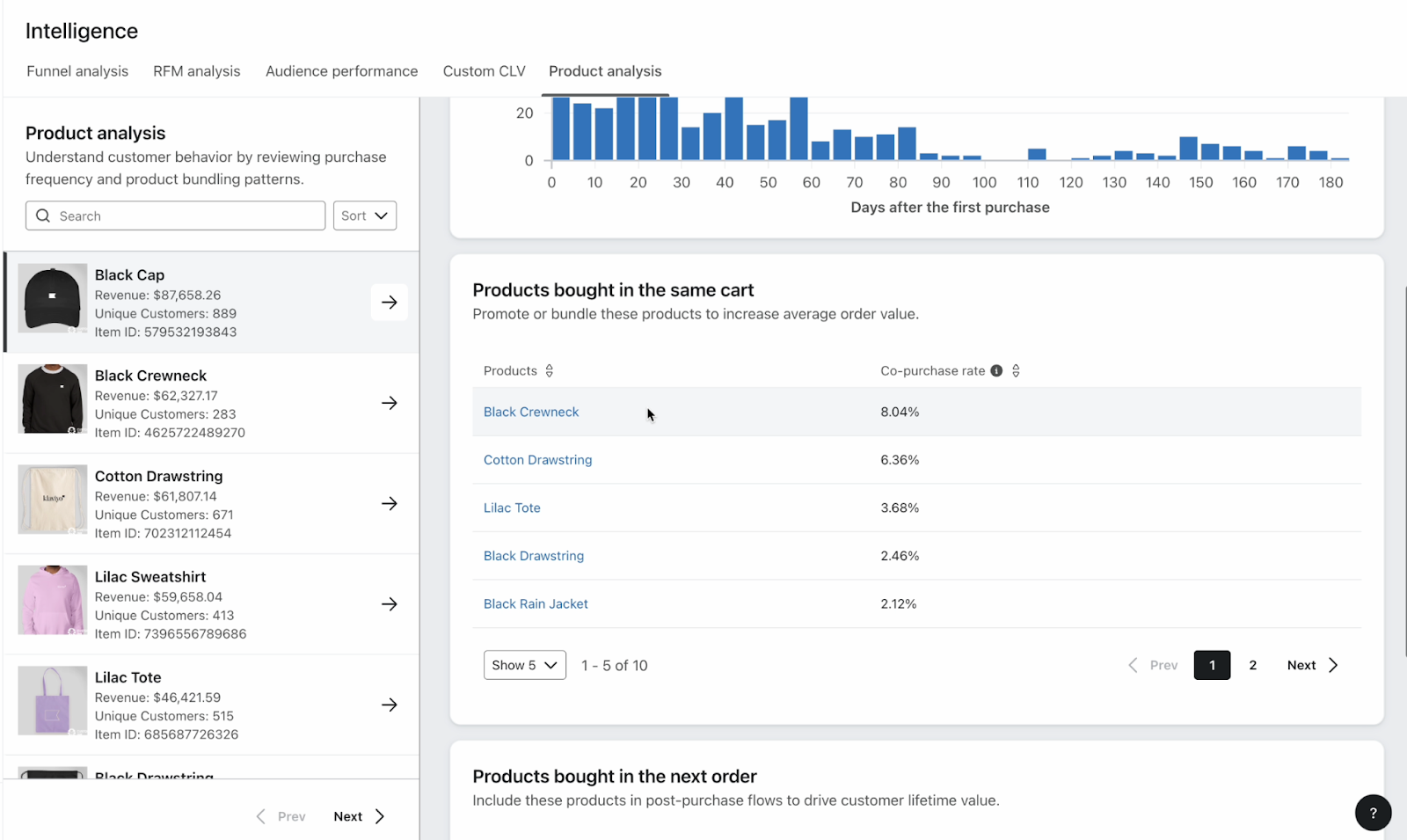 3. In your product analysis, take a look at which products are usually bought in the next order. In the example above, customers often buy an umbrella after purchasing a hoodie.