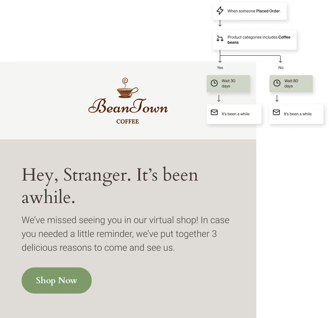 Beantown coffee set up a winback flow to remind lapsed shoppers to return to the site. Their winback flow is triggered by the Placed Order event and contains a time delay equal to their customers' average buying cycle.