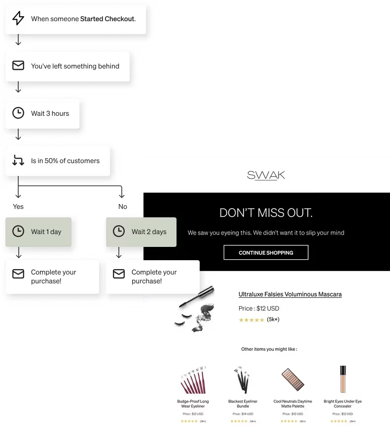 SWAK's abandoned cart flow reminds shoppers to purchase after they added items to their shopping cart, but never completed their purchase. Abandoned cart flows are the most profitable of all Klaviyo flows.