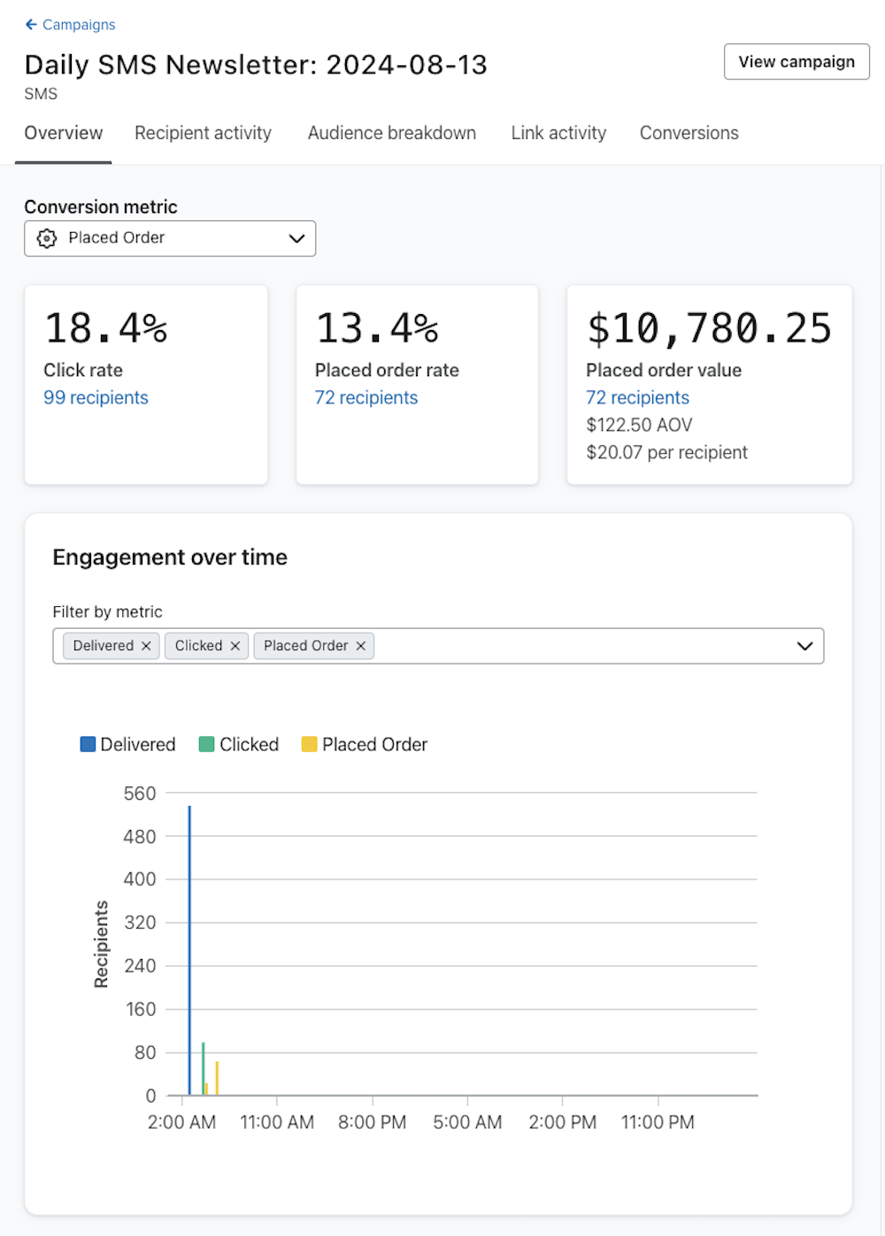 Click rate and conversion rate are 2 metrics included on this page. These metrics help you understand how your SMS messages are driving recipients to visit your site and make purchases.