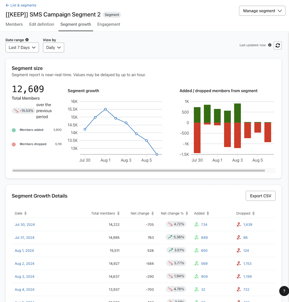 Use the segment growth report to quickly visualize how your SMS segments dynamically change over time.