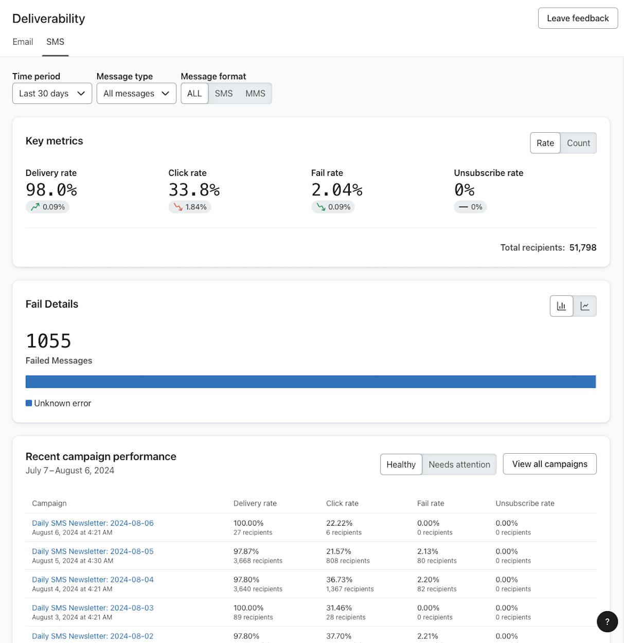 The SMS deliverability hub shows you key metrics on how your messages are delivering. High deliverability is crucial for SMS success, because if your messages never reach your subscribers, they certainly won’t drive engagement or conversions.