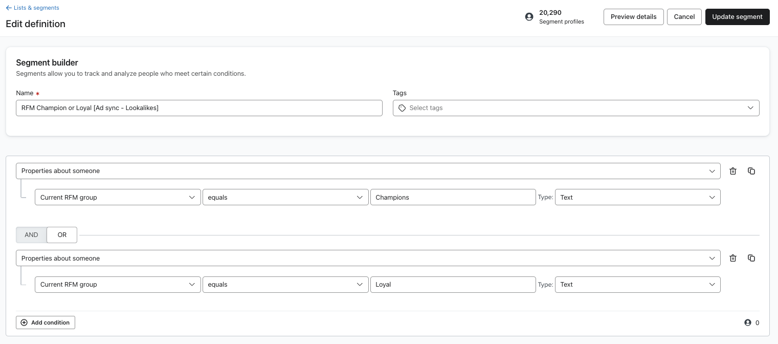 • Loyalty/appreciation flow: Trigger a flow when customers become RFM Loyals or Champions.