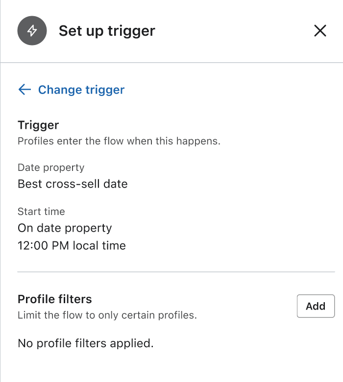 The trigger for a best cross-sell date flow in Klaviyo.