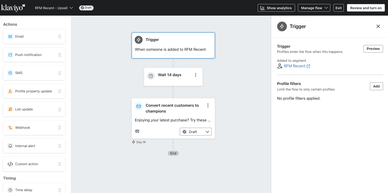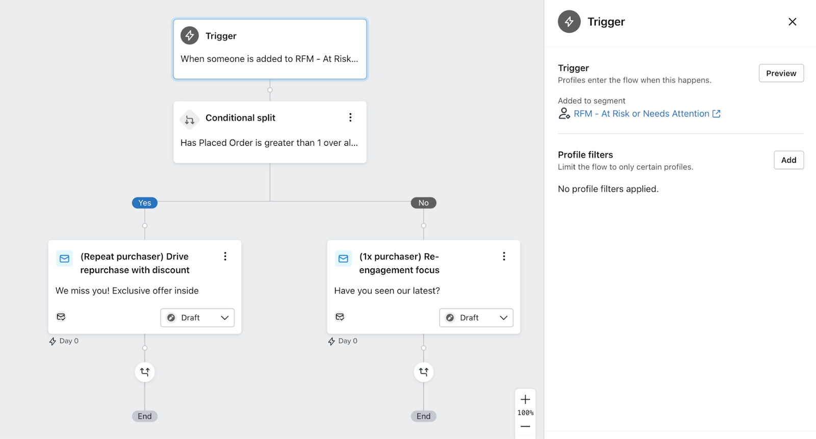 • Buyer retention flow: Trigger a flow before customers churn, when they become RFM Needs attention or At risk.