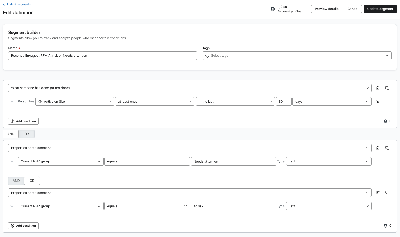 • Retarget recently engaged customers (recently onsite [AND] At Risk [OR] Needs attention)