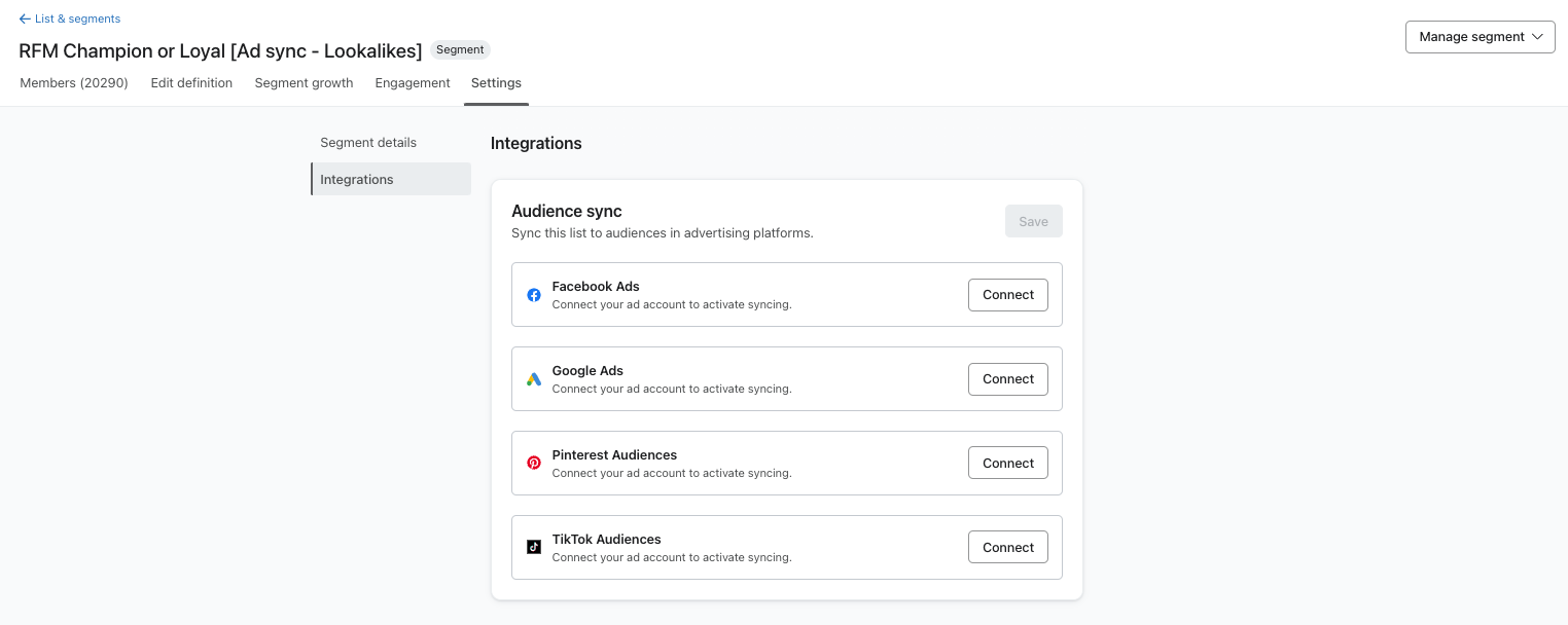 • Once you’ve created segments, sync them through your integration to your ad platforms: