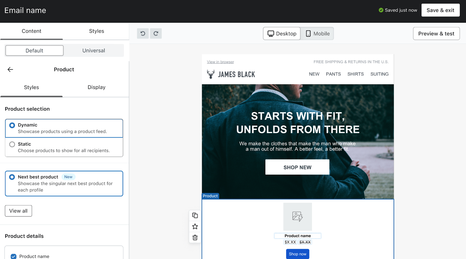 The next best product block is highlighted in the Klaviyo email template builder.