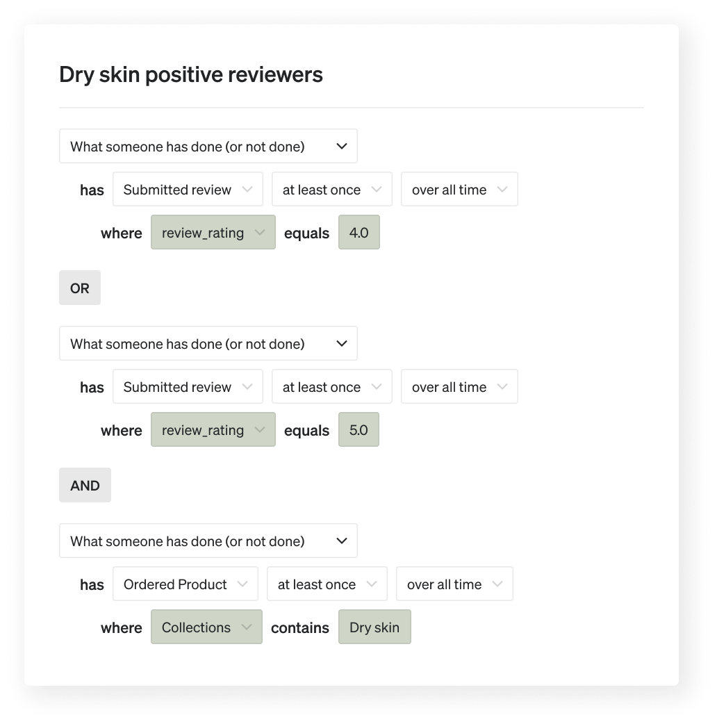 For example, let's say you want to promote a line of face cream for dry skin. You can create the following segment of customers who rated your products highly and recently bought dry skin products: