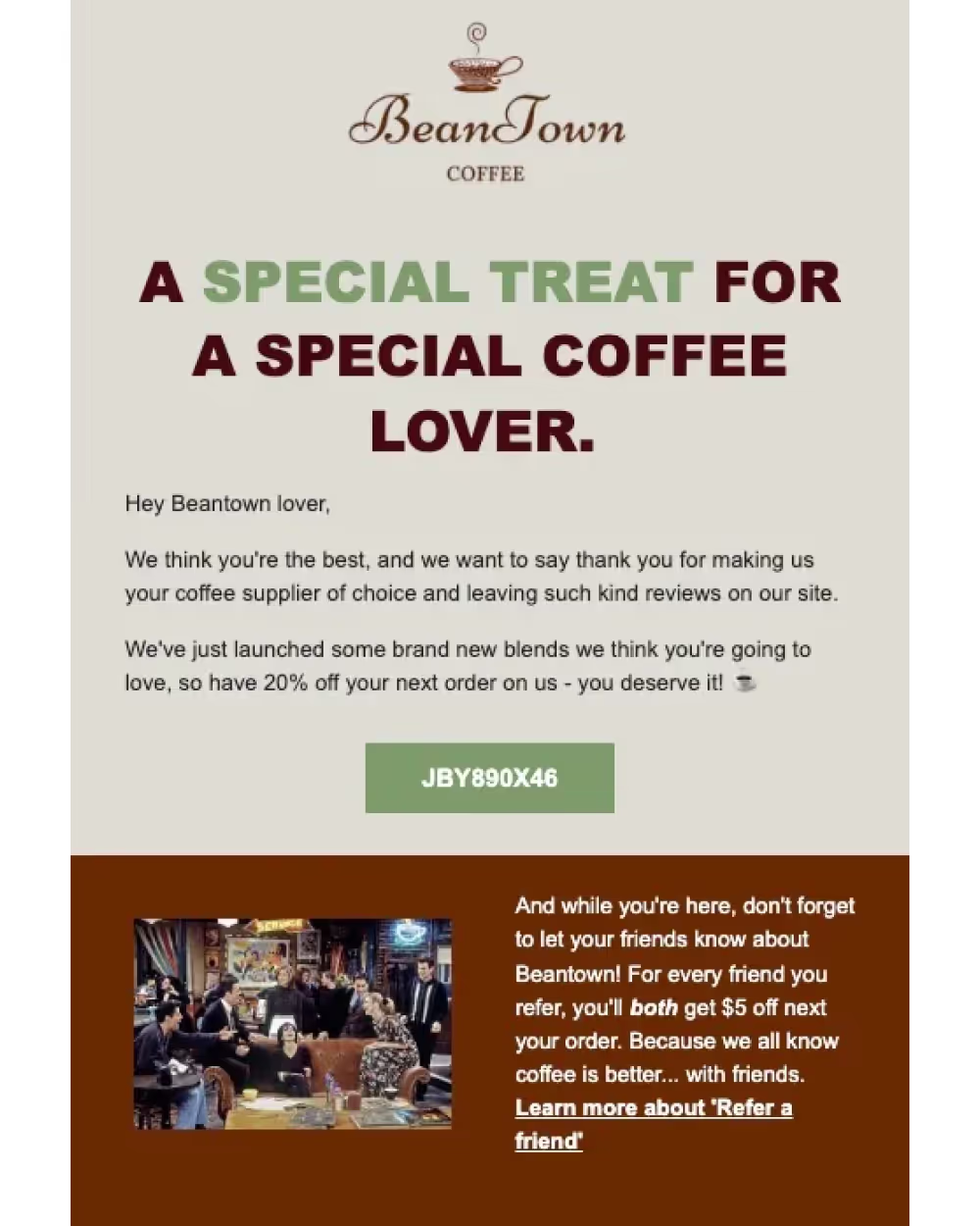 Alternatively, you could target lower rating reviews, like a 3-star shopper who said that your product wasn’t the best fit for a specific reason. If you have alternative products that may better suit their needs, send them information and a discount to make up for their initial experience. For example, many BeanTown customers tried the new Extra Dark Blend and reported through reviews that it was way too bitter. BeanTown can segment these customers and send a targeted campaign suggesting that they try the best-selling Medium Blend, with a 10% discount.