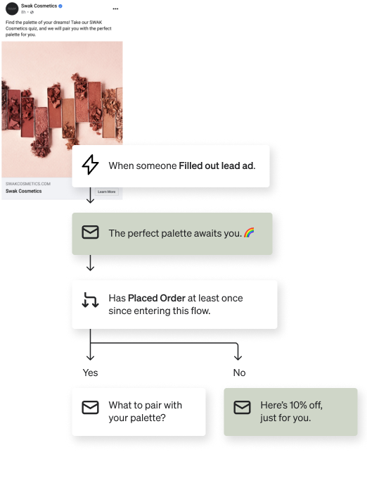 A golden rule of acquisition: fulfill the promises you make. ABC Agency builds a flow that sends once someone fills out SWAK's lead ad. They even split the flow based on if someone shops.