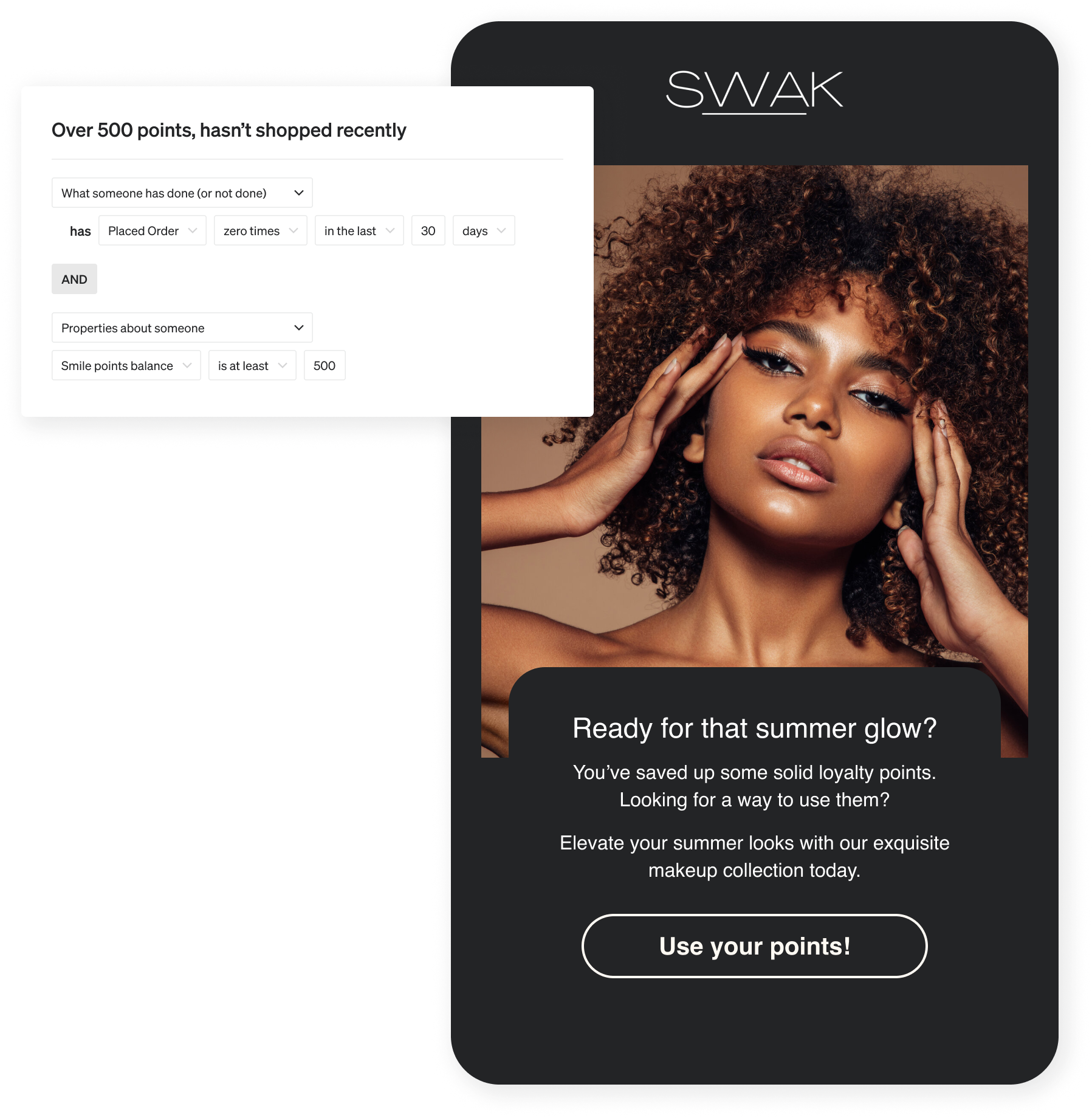 Now that you have new metrics syncing from your integration, build relevant segments based on what someone has or has not done in the tool. ABC Agency has a base-level VIP segment, that is used to trigger a VIP loyalty flow. This flow will encourage someone to join their VIP program to gain loyalty points via Smile and incentivize them to post on social media (this data will then sync to Klaviyo via Gatsby). They also use engagement data from these tools (e.g., number of times they mentioned SWAK on social, or number of loyalty points gained) to build more robust segments of their VIP audience.