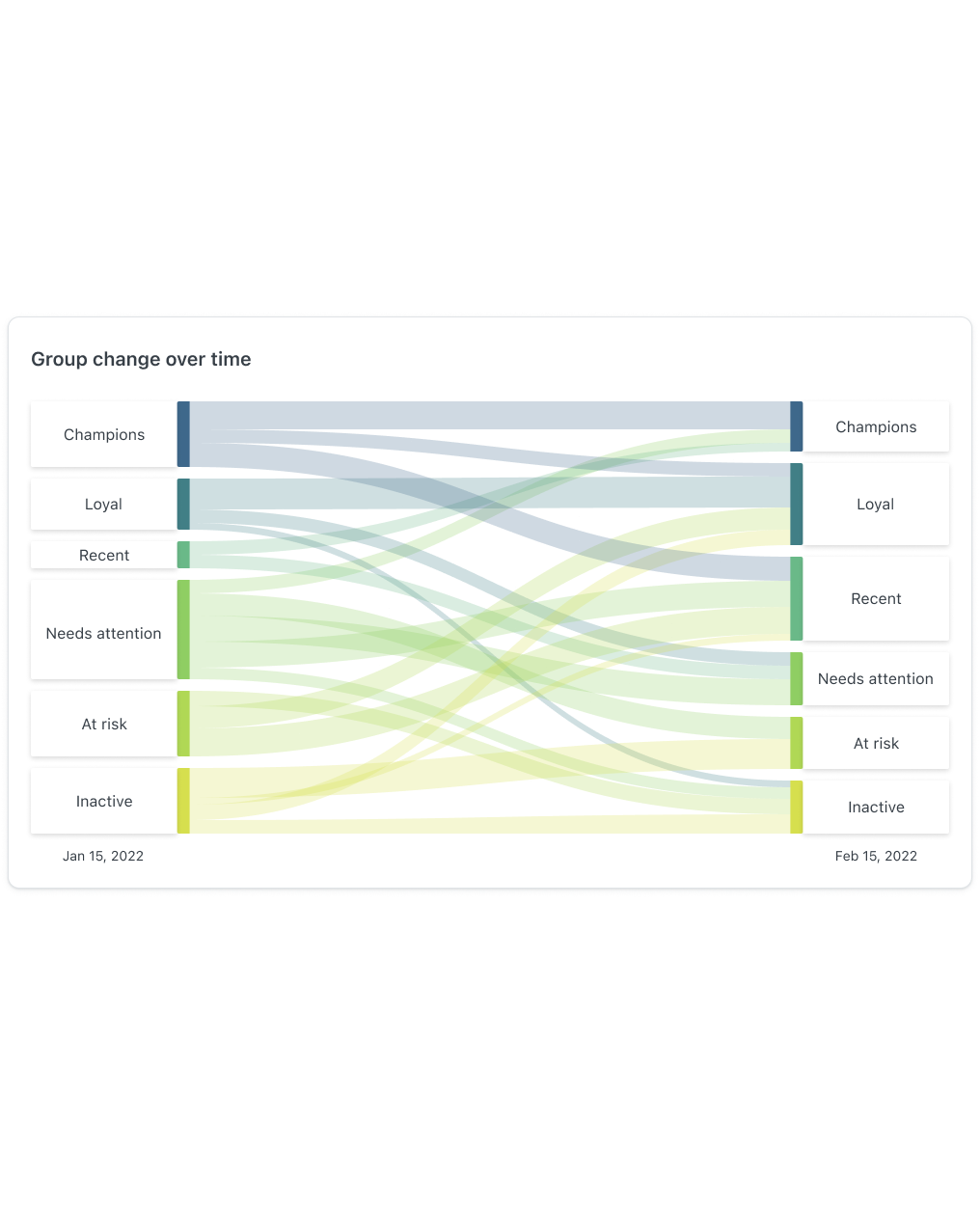 A month later, SWAK re-reviewed their RFM analysis to track the impact of their efforts. At the bottom of the report, there's a card that displays group changes over time. The goal is to reduce the number of loyal customers moving to Needs Attention or At Risk and either maintain or elevate them to Champions. By tracking this card, SWAK can monitor whether their efforts are preventing customer drop-offs.