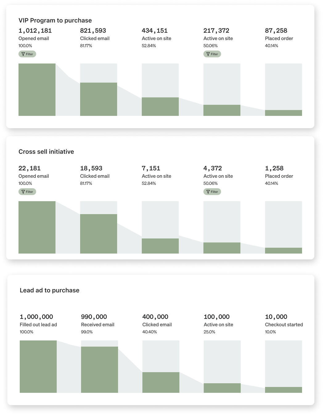 While you can track high level performance of your efforts with a campaign or flow overview report, the funnel analysis report will help you identify key drop-offs and inflection points throughout your customer’s journey that may be impacting your overall conversion rate.