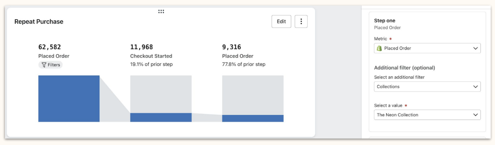 Do specific products or categories drive a second purchase more often? Build a repeat purchase funnel and filter by product or category to see how different items influence follow-up purchases.