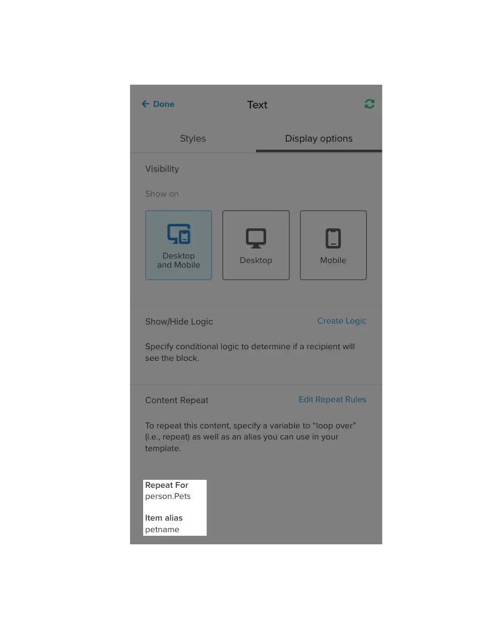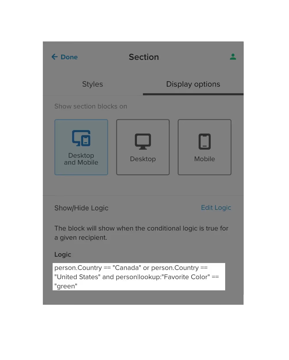 To edit show/hide logic, select the block or section in your template and click Display options. Then, review and edit any show/hide logic from the Show/Hide Logic section.