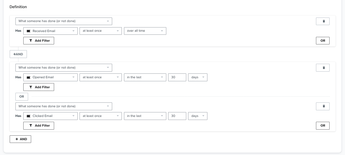In this example, profiles will only enter the segment if they have ever received an email AND either opened or clicked an email in the last 30 days.