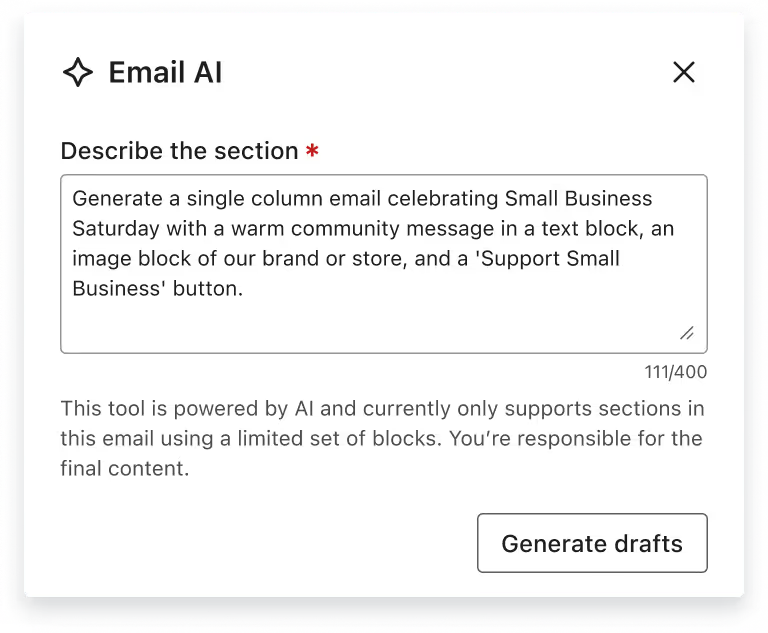 Segments AI lets you quickly hone in on the right customers. Use Email AI to generate content and customize email layouts easily with simple text inputs. And with SMS AI, you can choose from ready-made messages that fit your brand and goals, or take inspiration to craft personalized messages.