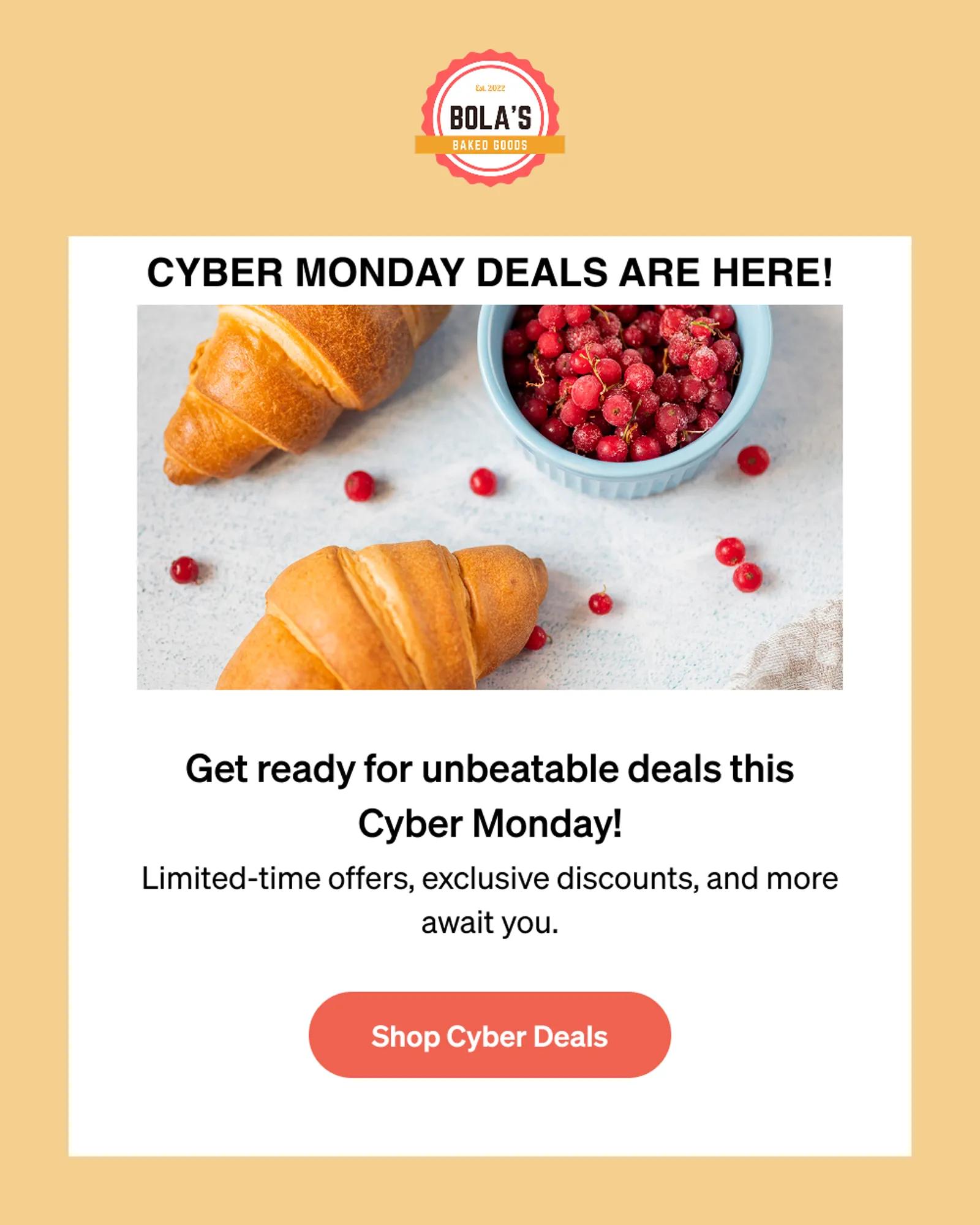 - Generate an email draft featuring a large banner image announcing our Cyber Monday deals, a text block with details about limited-time offers and a call-to-action button saying 'Shop Cyber Deals' to convey a sense of urgency and excitement.
