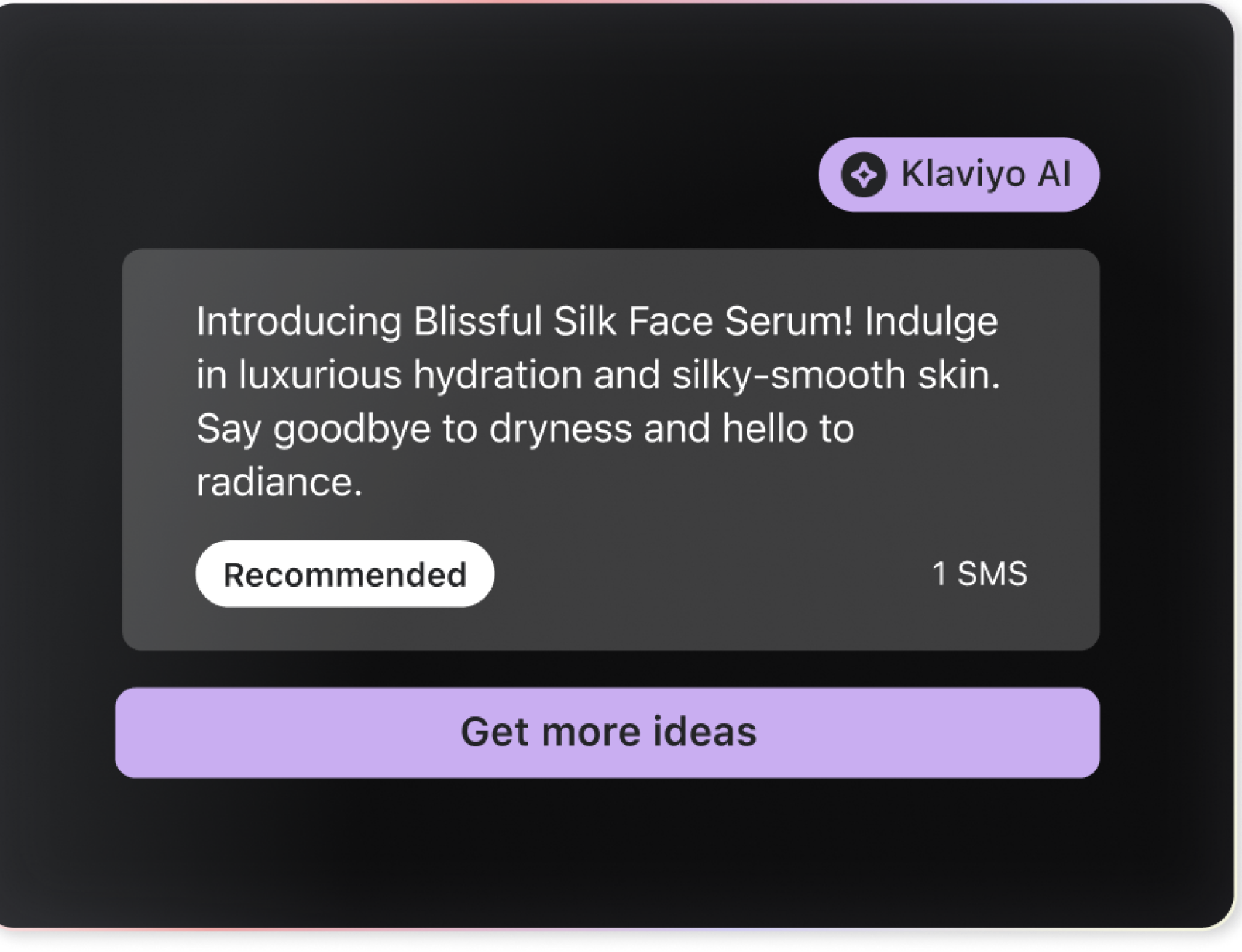 In text message marketing, every character counts, and impactful messaging is crucial. Klaviyo’s SMS assistant can streamline this process by quickly generating concise, mobile-optimized copy. Just input your campaign highlights, and you'll receive three optimized text message copy options to choose from.