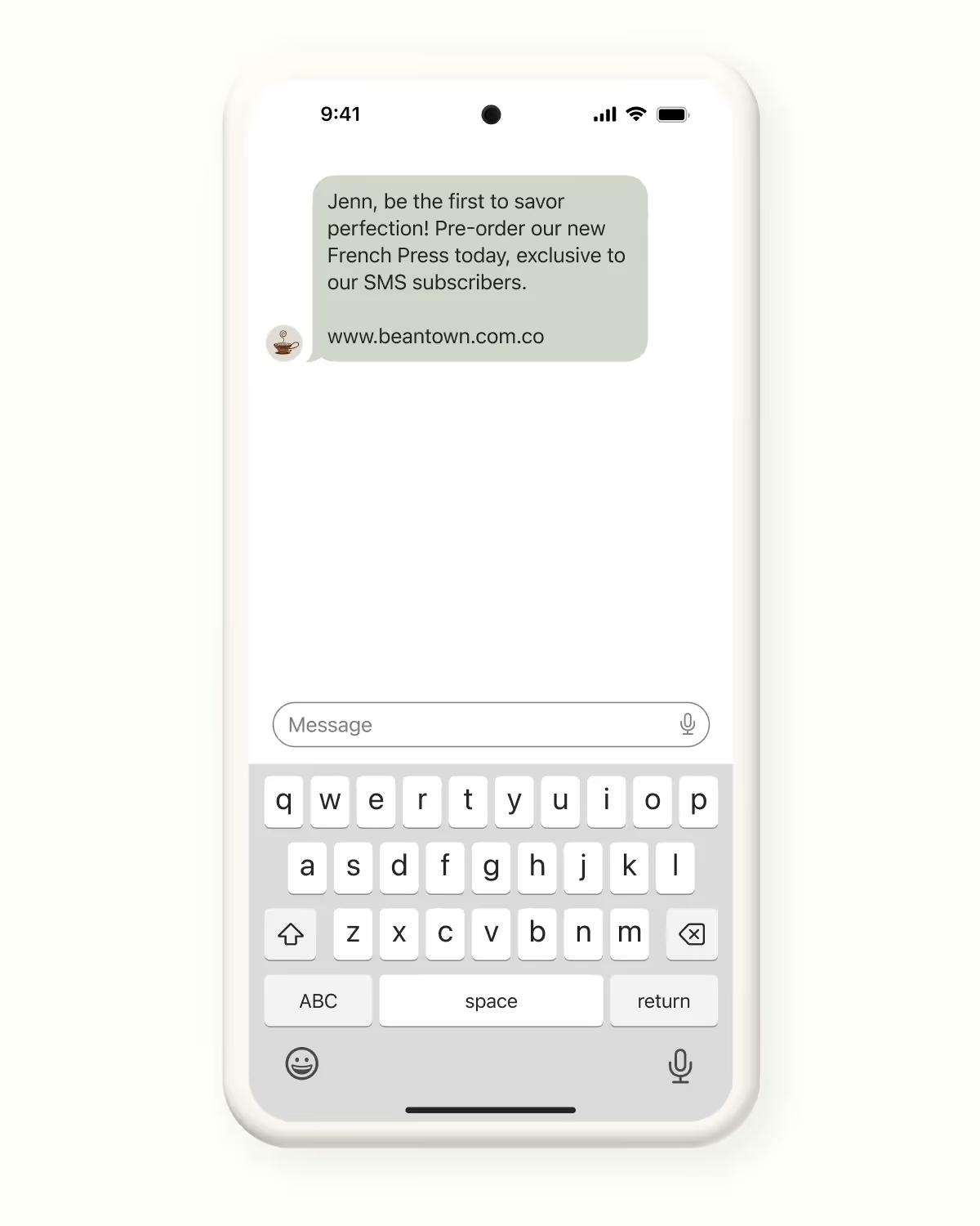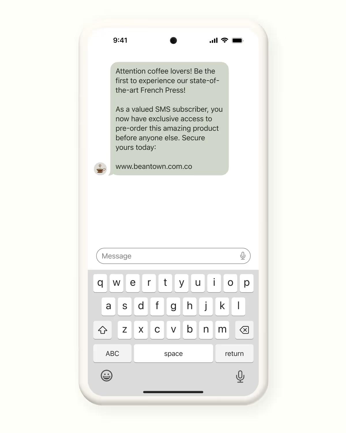 "Soon we will be launching our brand new state-of-the-art French Press. Our text message subscribers are getting exclusive first-access to this new product before anyone else. They can pre-order this amazing new product starting today, for the next two weeks."