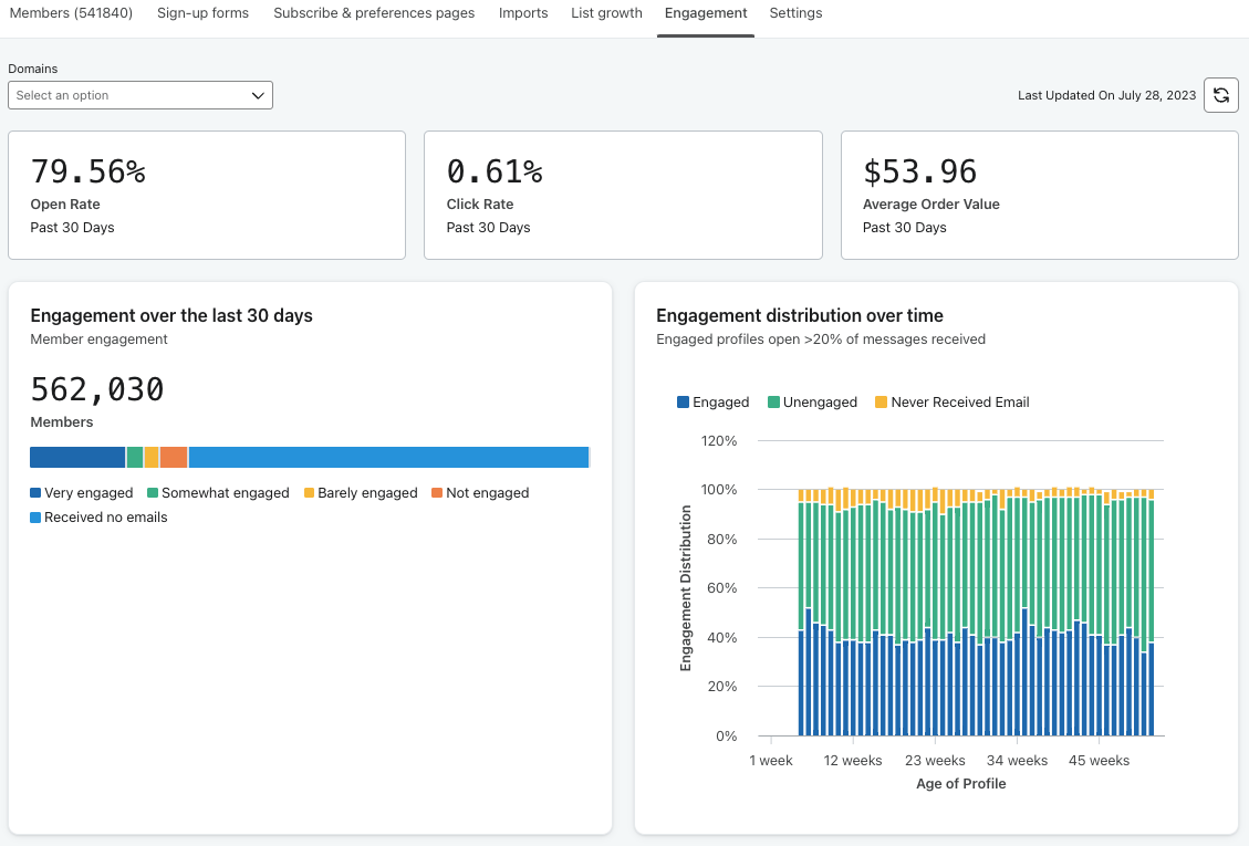 Pro Tip: As your audience grows over time, it’s important to keep an eye on any low engagement in specific segments. To mitigate poor deliverability risks, be sure to clean your list or remove inactive domains to boost deliverability and reputation.