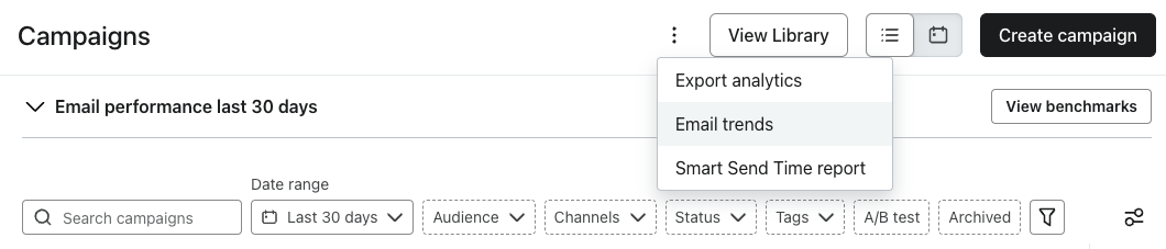 Go to the Campaigns tab, then click the three dots in the top of the page, then click Email trends.