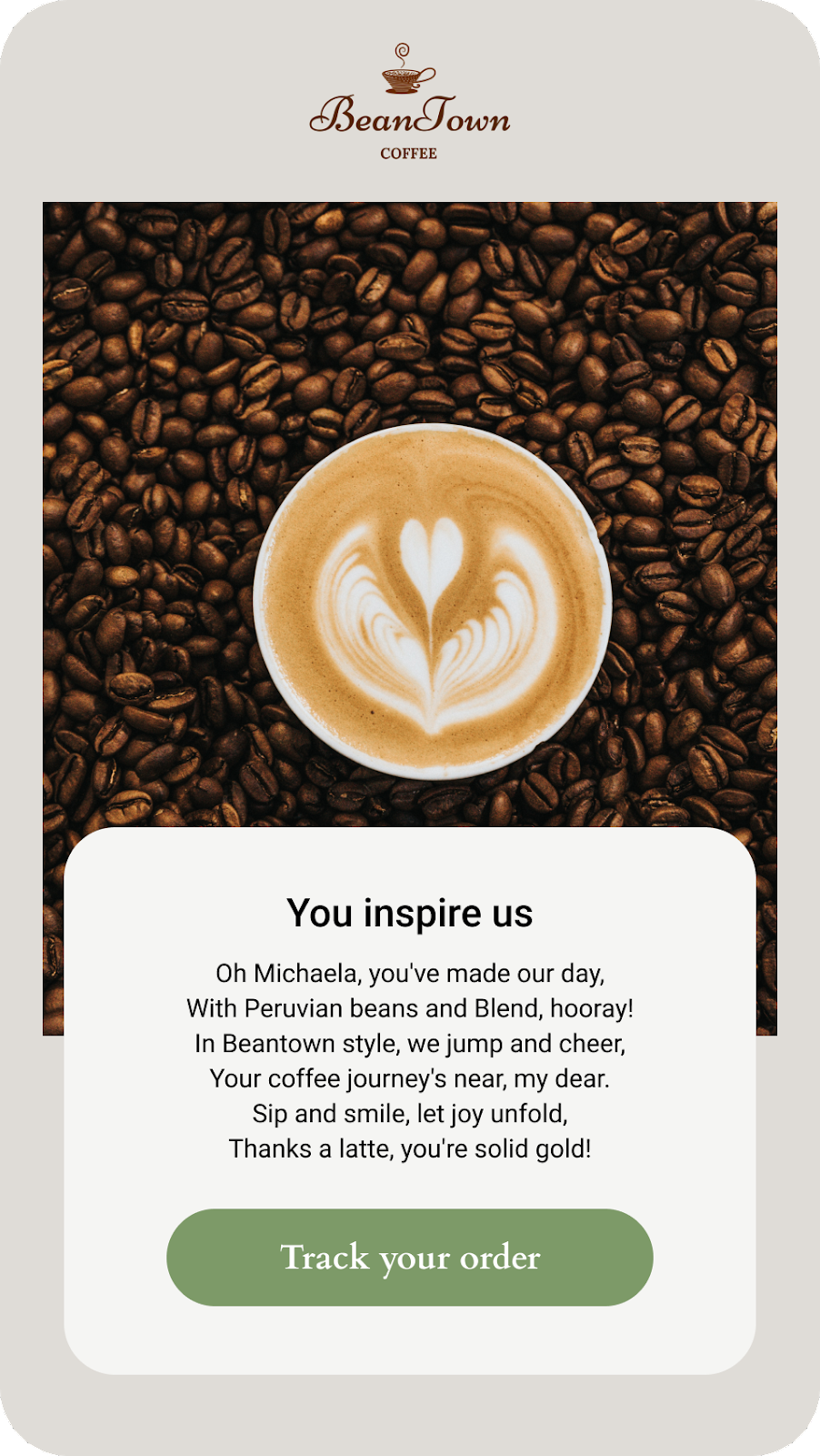 Beantown’s marketing team was playing around with ChatGPT and discovered its ability to write fun, short poems that can be completely customized. Instantly, they thought of including these poems in confirmation emails when VIP customers make purchases.