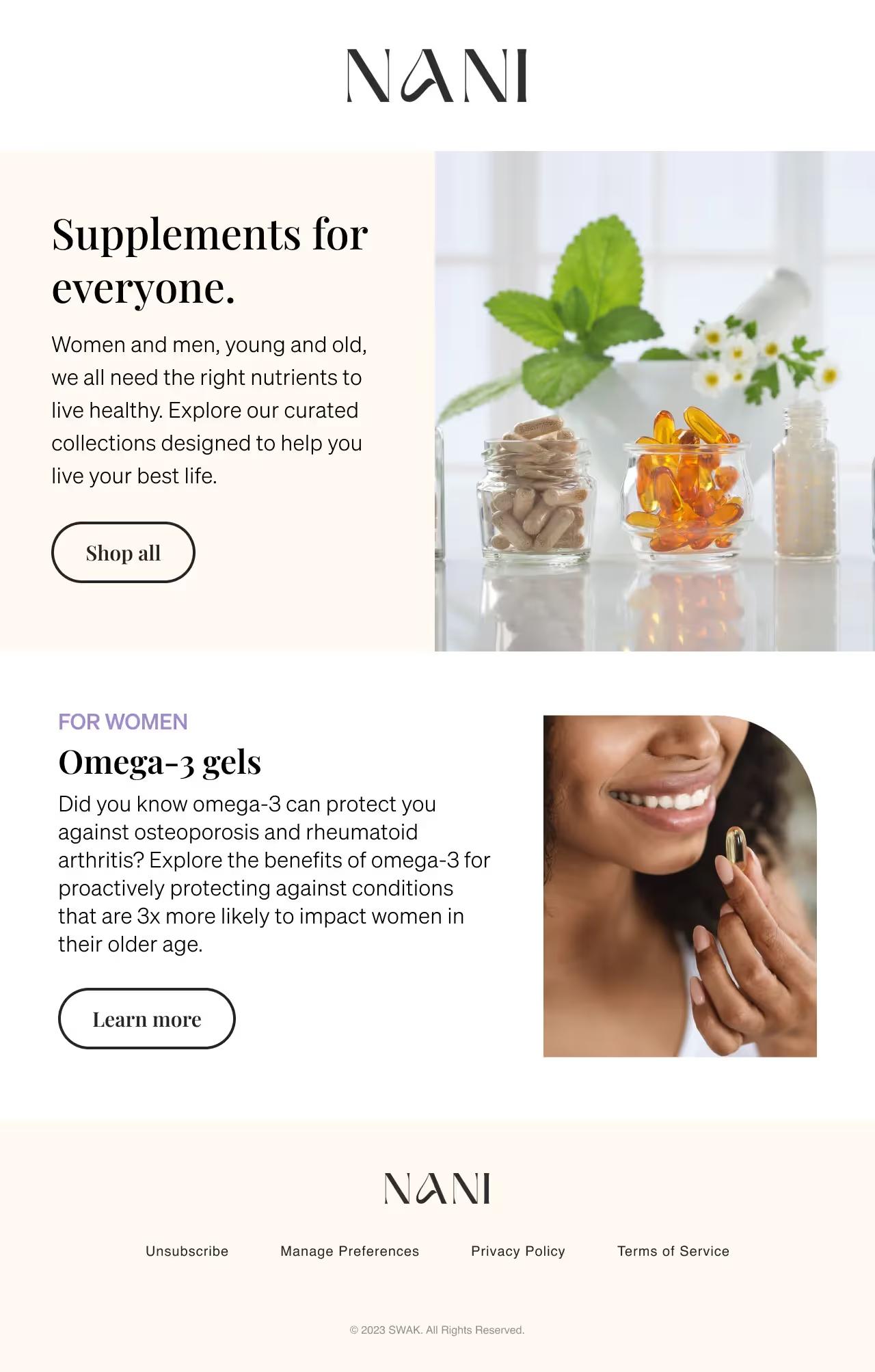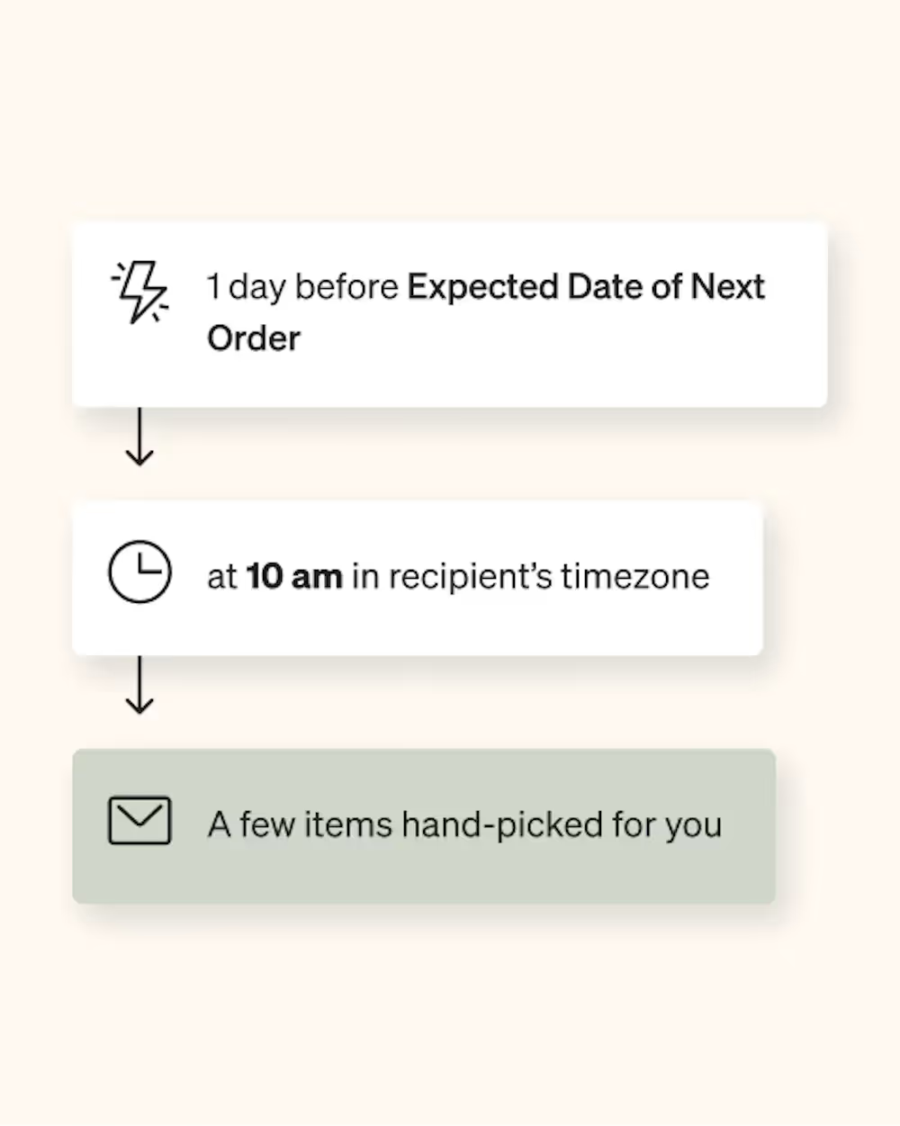 - In existing flows, use a conditional split where Expected date of next order is within 30 days. Include a personalized product feed with recommendations based on their previous browsing or shopping behavior.
