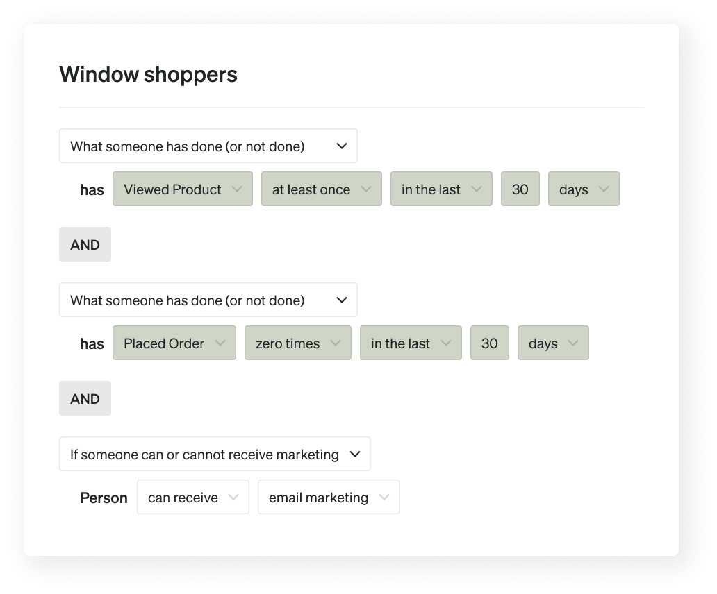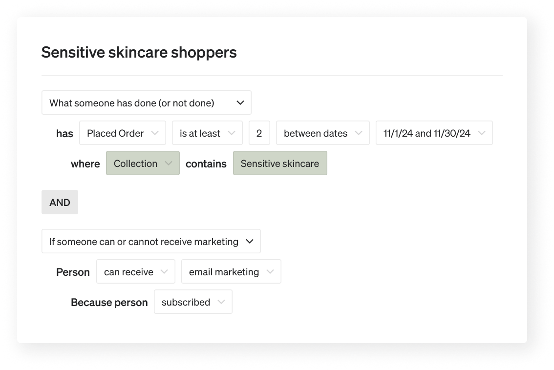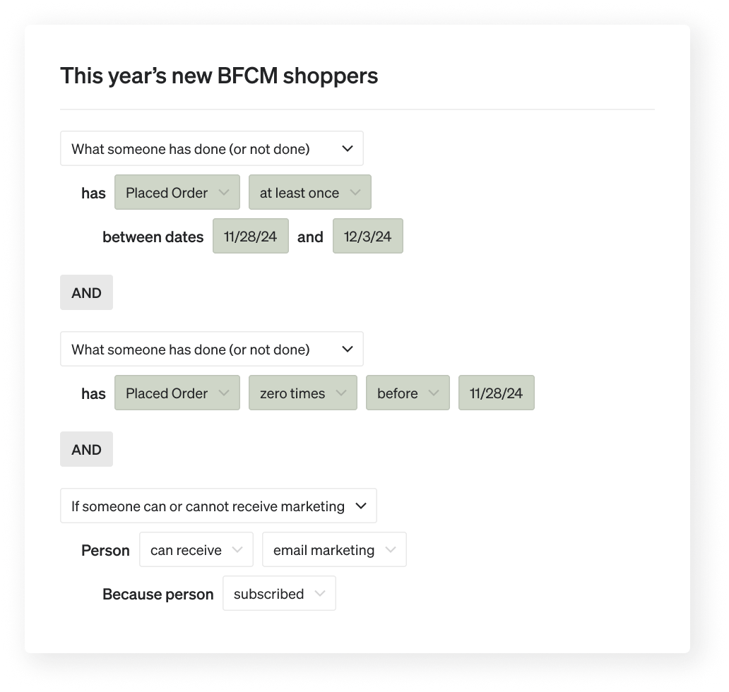 As BFCM comes to a close, you’ll likely have an abundance of data at your fingertips: spikes in purchases, email and SMS engagement trends, and recent on-site behavior. Create key segments that focus on this customer information in order to better personalize post-BFCM content and monitor growth going into the new year.