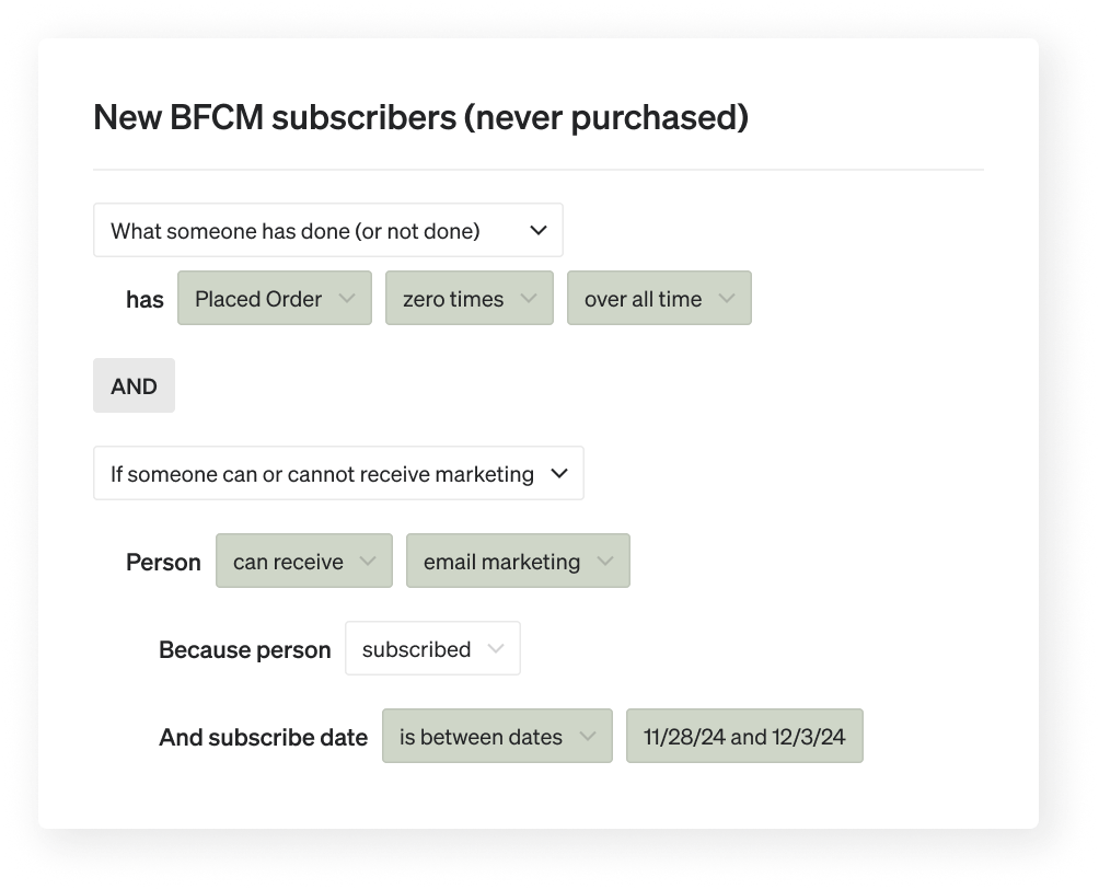 Who: All new subscribers over Cyber Weekend. Use the segment condition Person can receive email marketing because person subscribed and subscribe date is between dates ___ and ___", inputting the dates of your BFCM deals.
